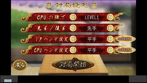 「フリー対局」では通常思考対局で対CPUが、二人対局で対人での対局が楽しめます。CPUの強さはレベル1から3までの3段階。レベル1でも中々の強さです。